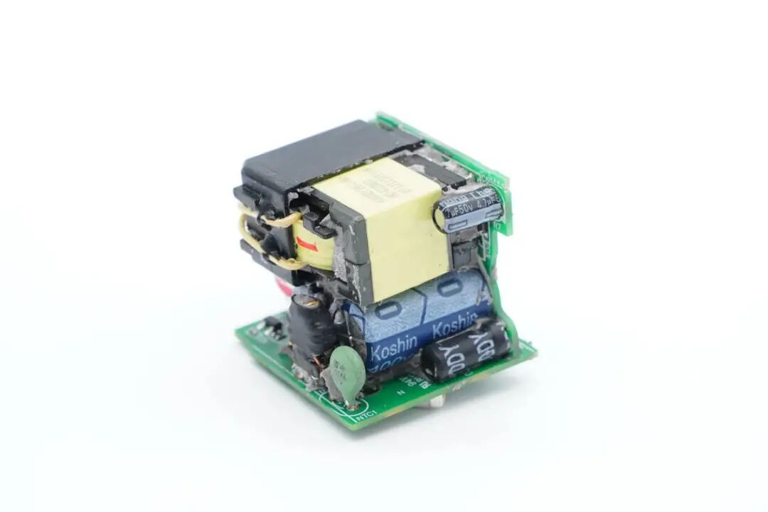 输入端一览,底部小板上设有NTC热敏电阻以及共模电感,侧边小板上有工字电感、高压滤波电解电容、主控芯片供电电容以及变压器。