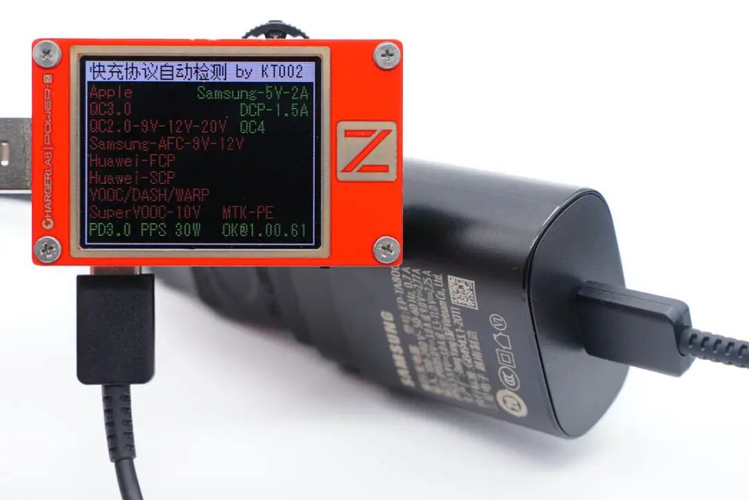 使用ChargerLAB POWER-Z KT002测得这款充电器支持三星5V2A、PD3.0、PPS快充协议。