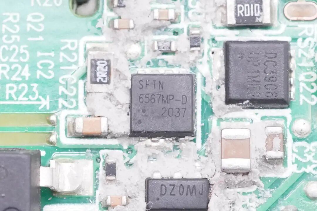 清理干净可以看见板子背面设有整流桥、开关电源初次级控制器和MOS管、光耦、协议芯片以及输出VBUS开关管。