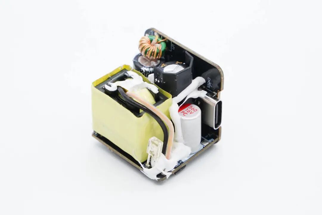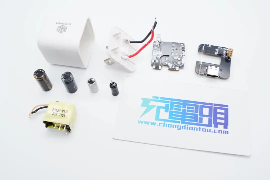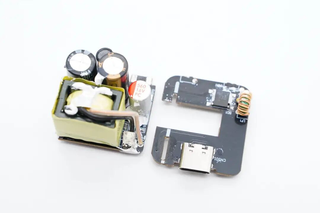 其中一块PCB板外侧设有保险丝和贴片Y电容,以及快充协议芯片。