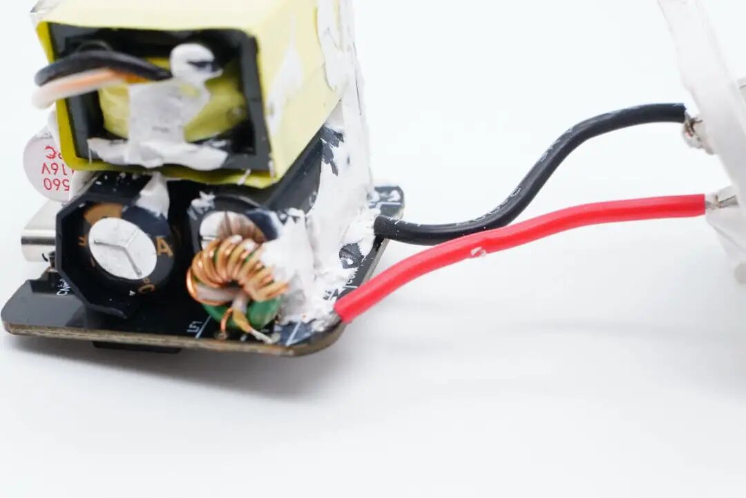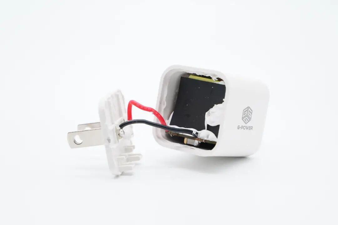 将充电器的外壳从插脚侧打开,内部由两根导线连接插脚和内部PCB板模块。