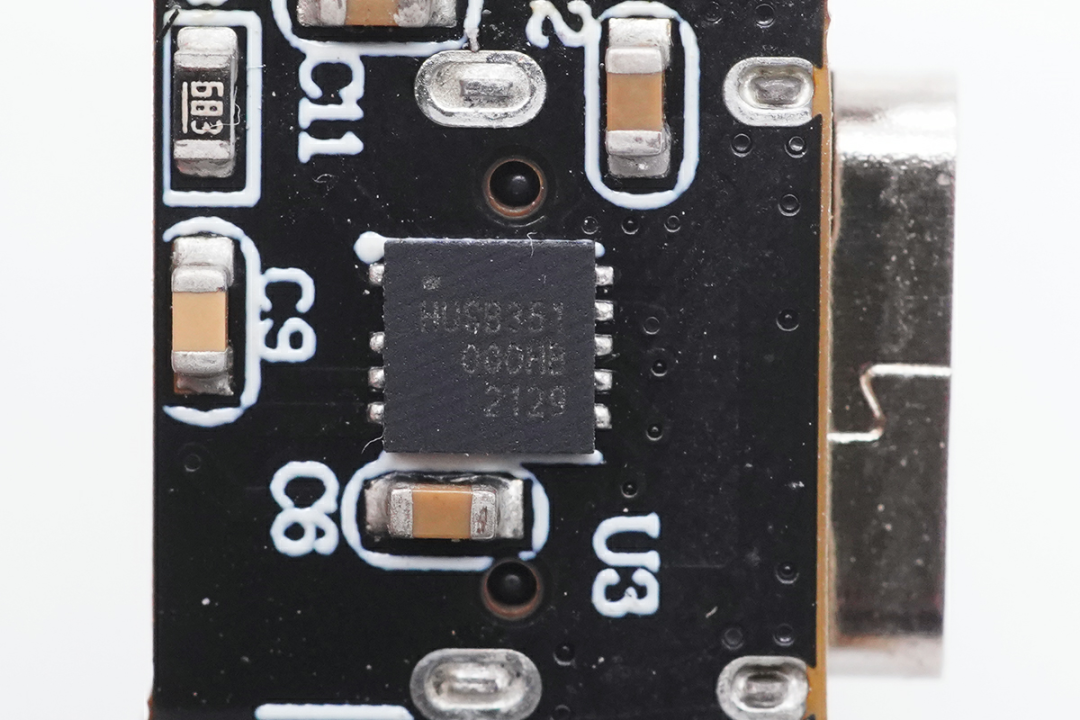 输出协议芯片采用的是慧能泰HUSB351,内部集成了超低Rdson的NMOS和电流采样电路,封装尺寸仅为3*3mm,既支持控制光耦的环路调节,应用于AC-DC电源;也支持FB环路调节,应用于DC-DC电源。