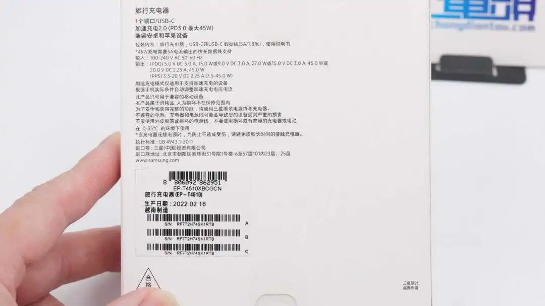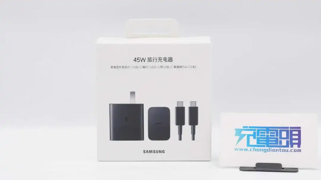 值得一提的是,虽不附送充电器,但三星却给S22 Ultra、S22+两款手机设计了新款45W快充,型号改为EP-T4510,而且这还是一款氮化镓充电器,采用了知名厂商纳微的GaNFast芯片。下面充电头网就对充电器进行开箱拆解,一起来看看吧。