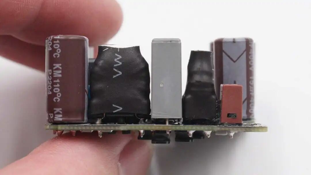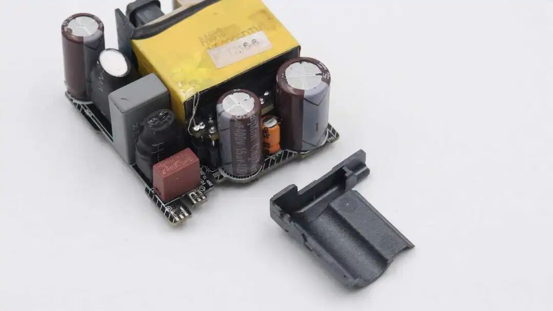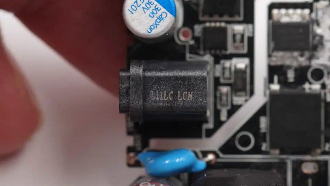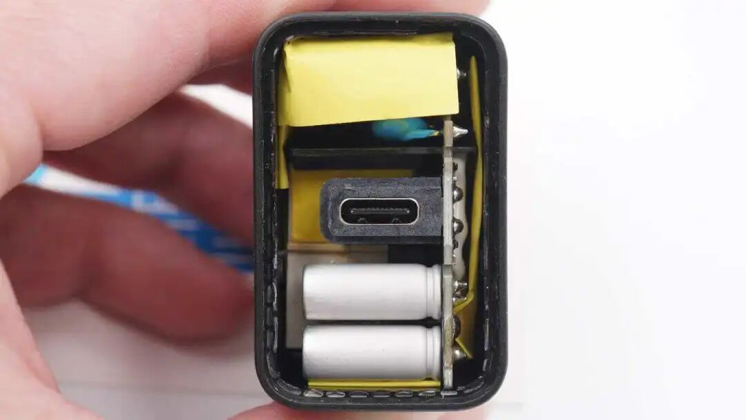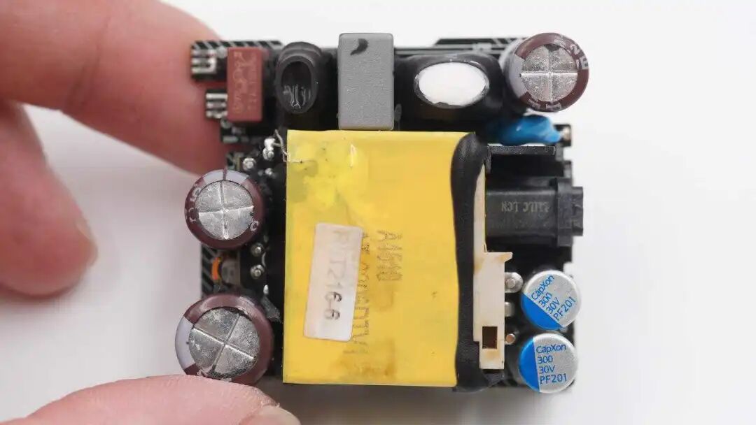 外壳内部是垂直焊接的USB-C母座,下方是两颗输出滤波固态电容,上方是Y电容。