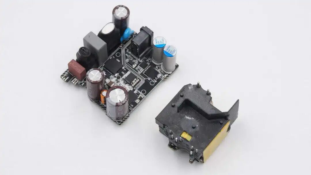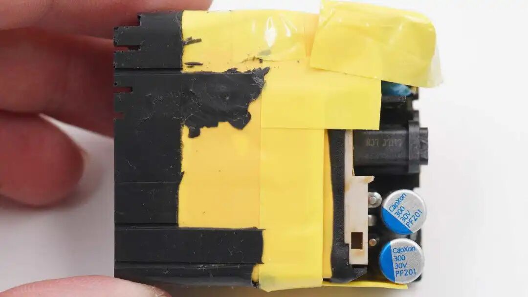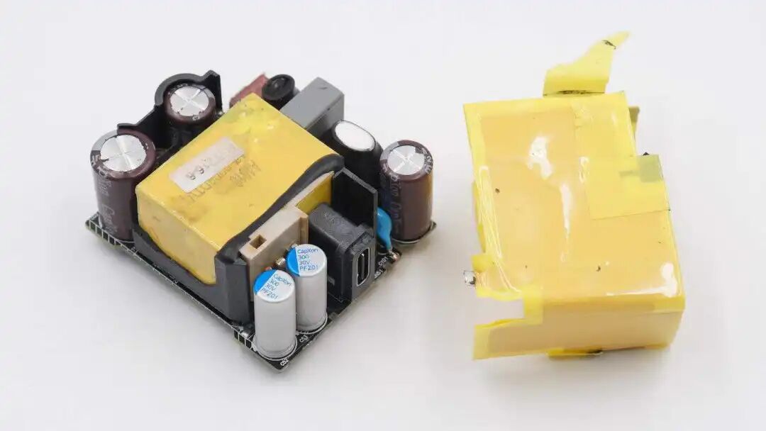 PCB模块贴有导热铜箔和绝缘胶带,并采用硅胶灌封,增强充电器的散热性能。