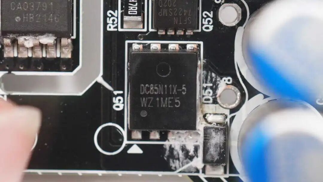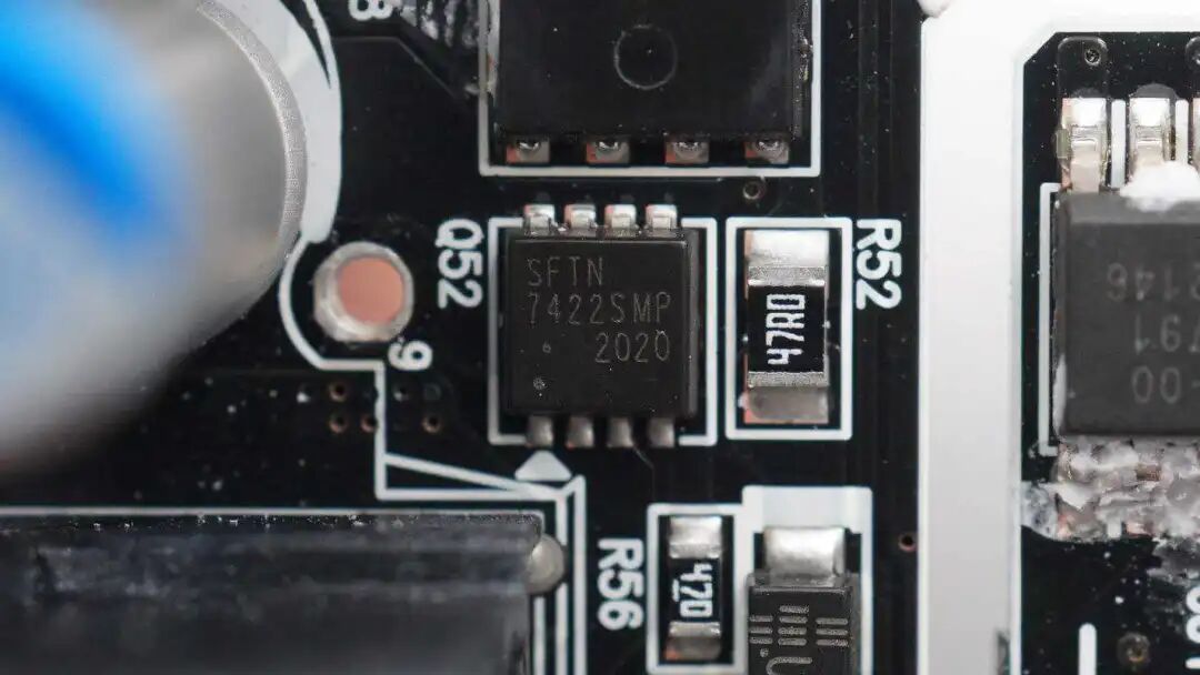同步整流管来自博盛,PDC85N11X-5,NMOS,耐压115V,导阻7.6mΩ,采用PPAK5*6封装,与Dialog iW709控制器搭配进行整流,输出低压脉动直流电。