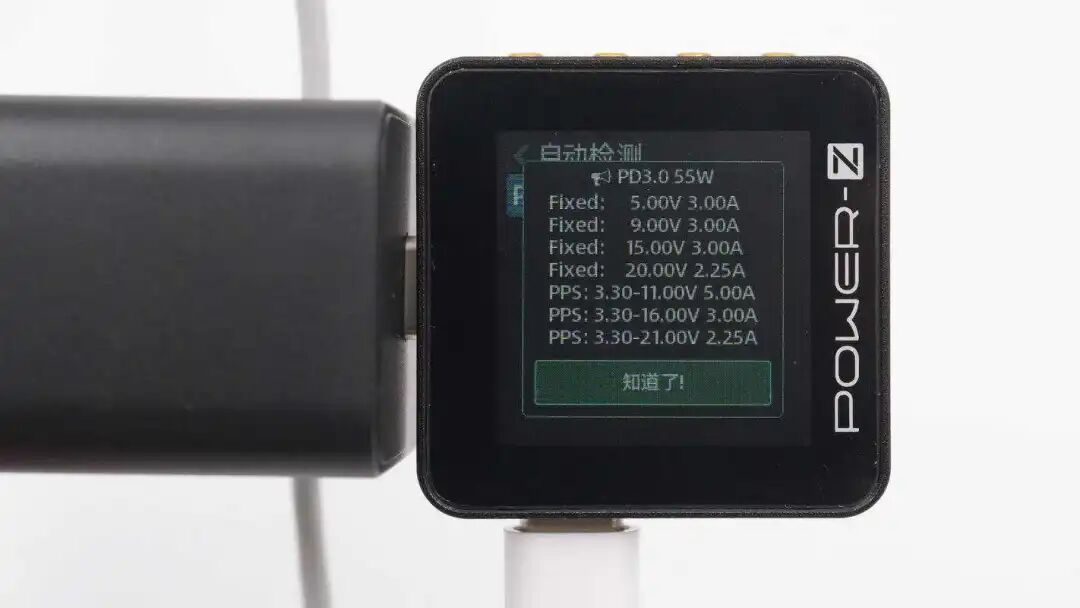 此外还具备5V3A、9V3A、15V3A、20V2.25A四组固定电压档位,以及3.3-11V5A、3.3-16V3A、3.3-21V2.25A三组PPS电压档位。