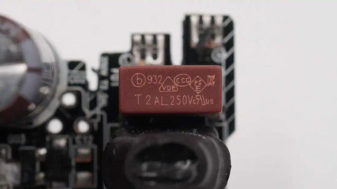 输入端保险丝来自贝特电子,出料号:932 2A 250V,具有慢熔断特性,能够承受充电器插电时电解电容的充电电流而不会熔断,规格2A 250V。