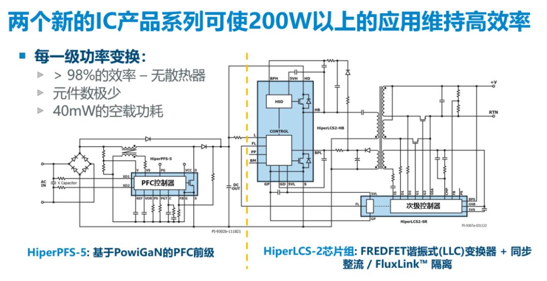 HiperLCS-2芯片组由一颗集成高带宽的LLC控制器、同步整流驱动器、FluxLink隔离控制电路的芯片,和一颗集成600V FREDFET、上管和下管的驱动器、无损耗的电流检测的独立半桥功率芯片组成。