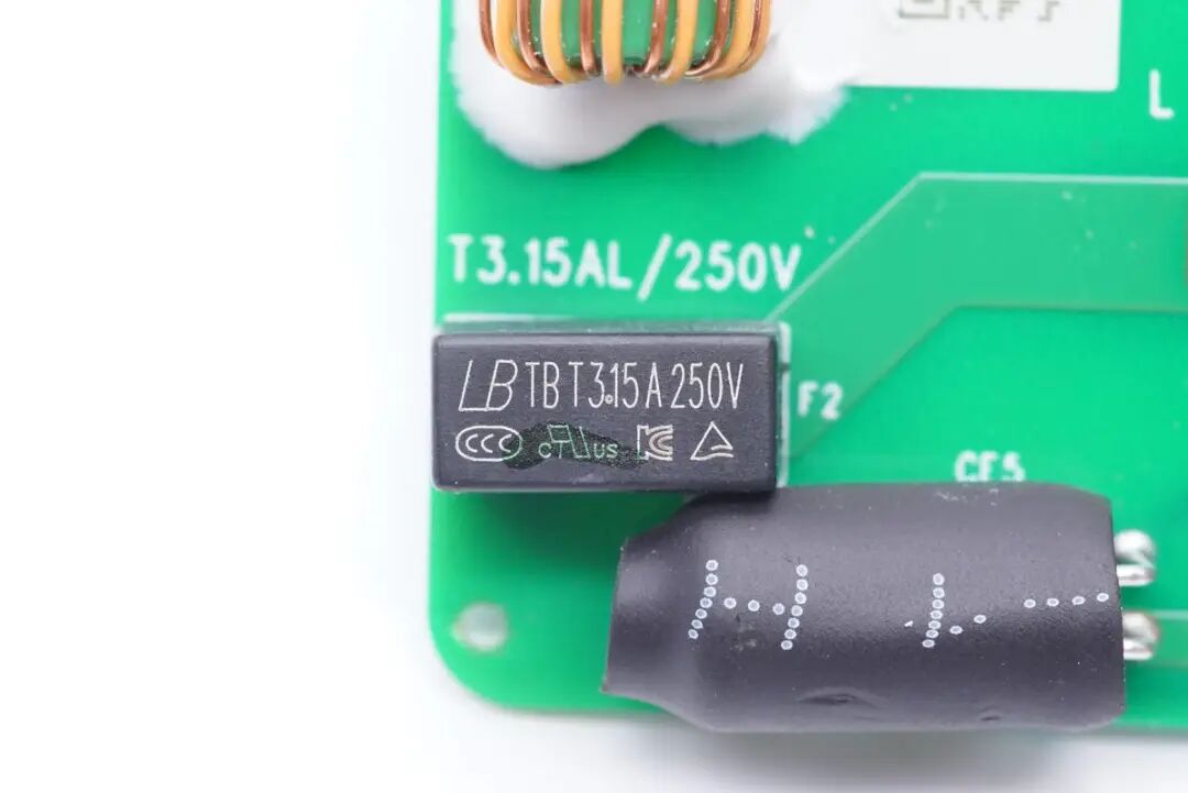电源输入端保险丝来自蓝宝,TB系列延时保险丝,规格为3.15A 250V。