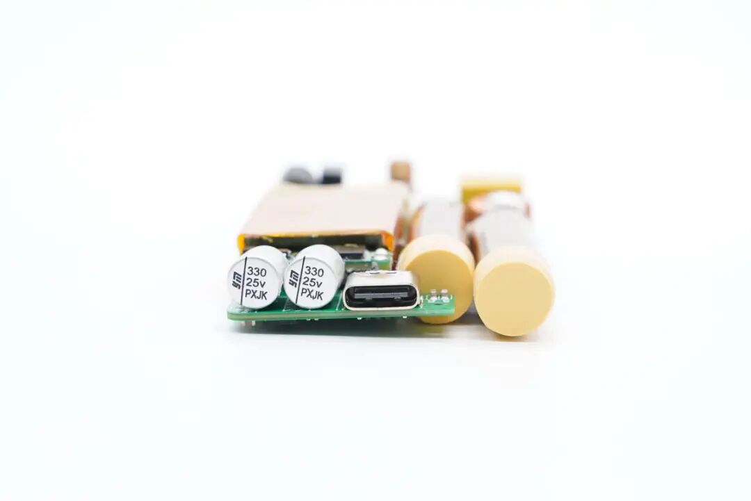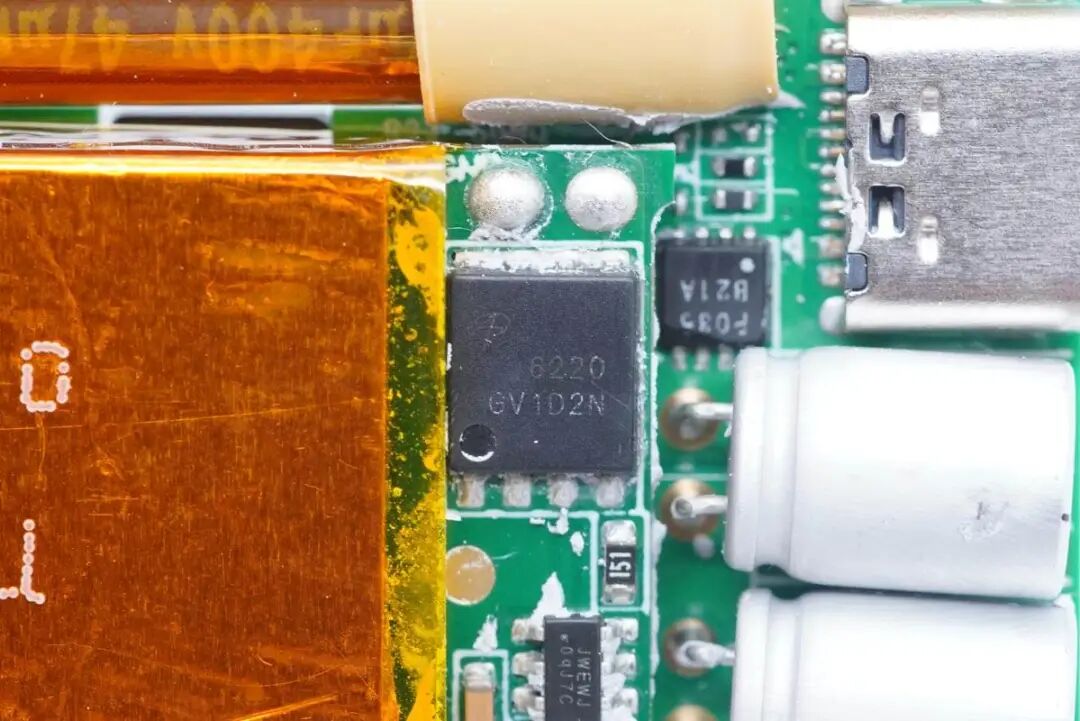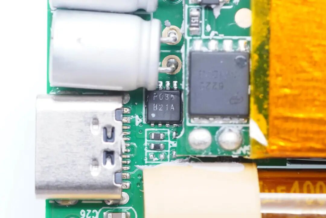 USB-C母座特写,过孔焊接。左侧是两颗滤波电容,为永铭NPX系列固态电容,规格为330μF 25V,电容具有小体积、低ESR、高容许纹波电流及高可靠性的特点。
