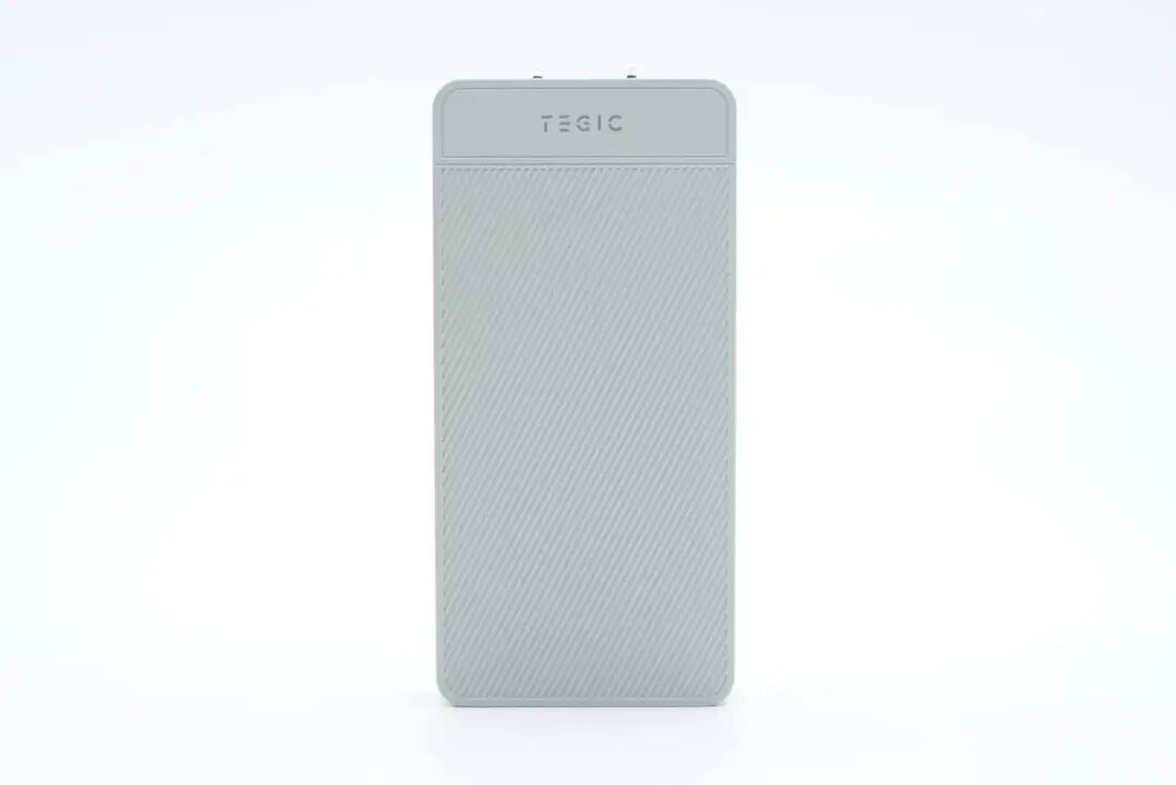 机身正面大部分区域做了斜纹理设计,增加产品的手感提高把玩性并增大散热面积,插脚一端平面设计并印有TEGIC品牌。
