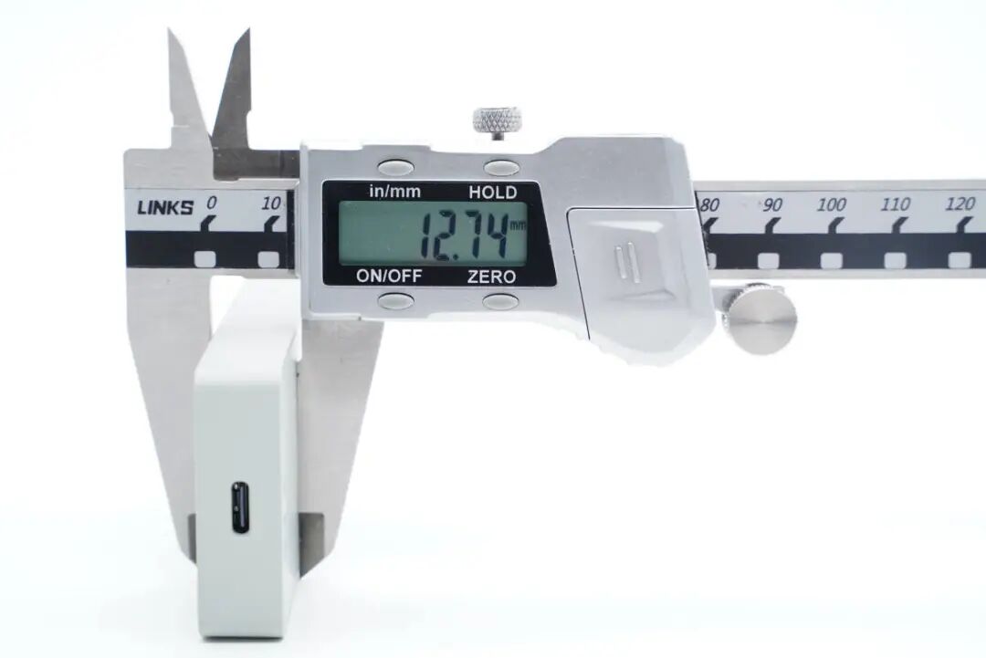 从侧面看去,充电器非常的薄,实测厚度仅12.74mm,超薄充电器当之无愧。