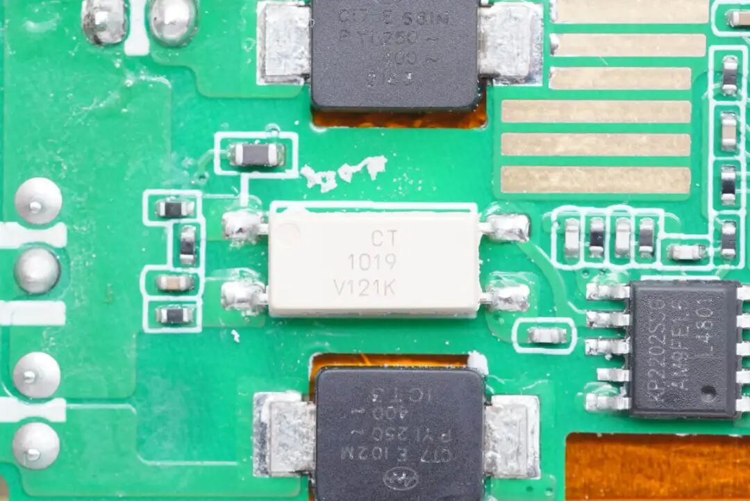 变压器正面输出端焊接同步整流管和同步整流控制器。