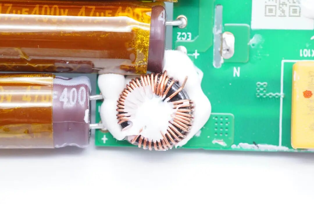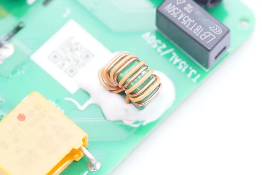 串联在两颗电容之间的差模电感,磁环绕制并打胶固定。
