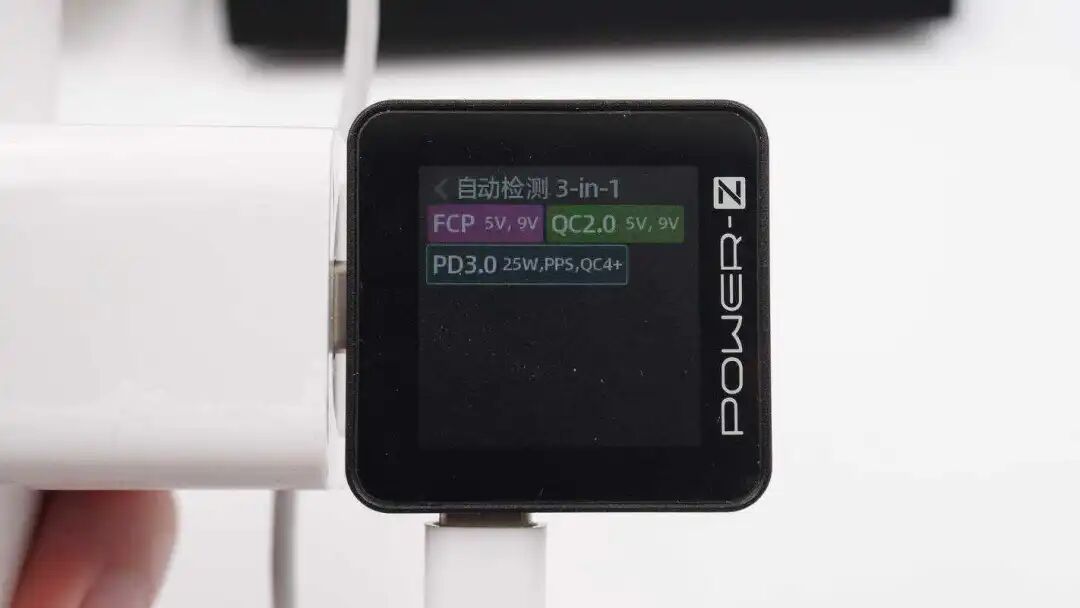 使用ChargerLAB POWER-Z KM002C测得充电器支持FCP、QC2.0、PD3.0、PPS快充协议。