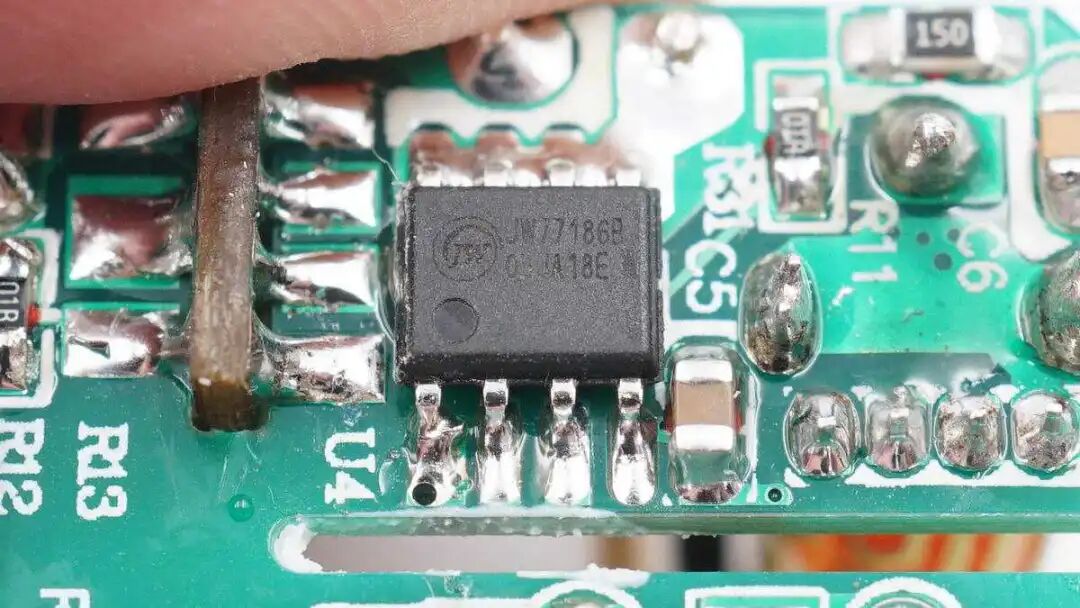 开关电源初级采用一颗一体化芯片,丝印C5818FZ,芯片内置开关管和驱动器,集成度高,外围元件精简,非常适用于小体积快充充电器使用。