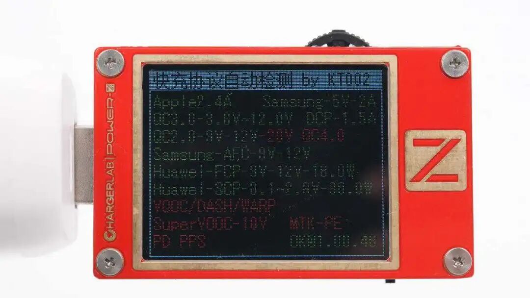 使用ChargerLAB POWER-Z KT002测得USB-A口支持Apple 2.4A、Samsung 5V2A、DCP协议,以及QC2.0/3.0、AFC、FCP、SCP快充协议。