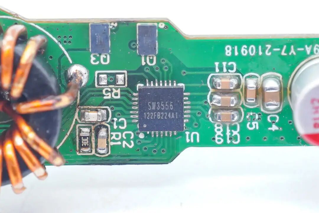 这套140W双C口氮化镓车充的主控芯片采用的智融最新发布的SW3556。该芯片支持双USB-C口降压输出控制,内置的同步降压转换器支持7A大电流输出,同时也内置了多种快充协议,并支持双口功率盲插以及独立限流。值得一提的是,该芯片支持氮化镓开关管,可获得更小的体积和更高的效率。