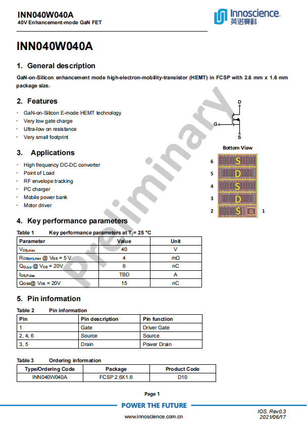 两颗外置的氮化镓功率器件来自英诺赛科,型号均为INN040W040A。这是英诺赛科最新推出的增强型硅基氮化镓功率器件,耐压40V,导阻仅为4mΩ,采用FCSP 2.6 mm x 1.6 mm的极小尺寸封装,后续会升级为QFN封装,提高了器件的可焊接性。适用于高频DC-DC功率转换、射频、电脑电源、移动电源、电机驱动等领域。
