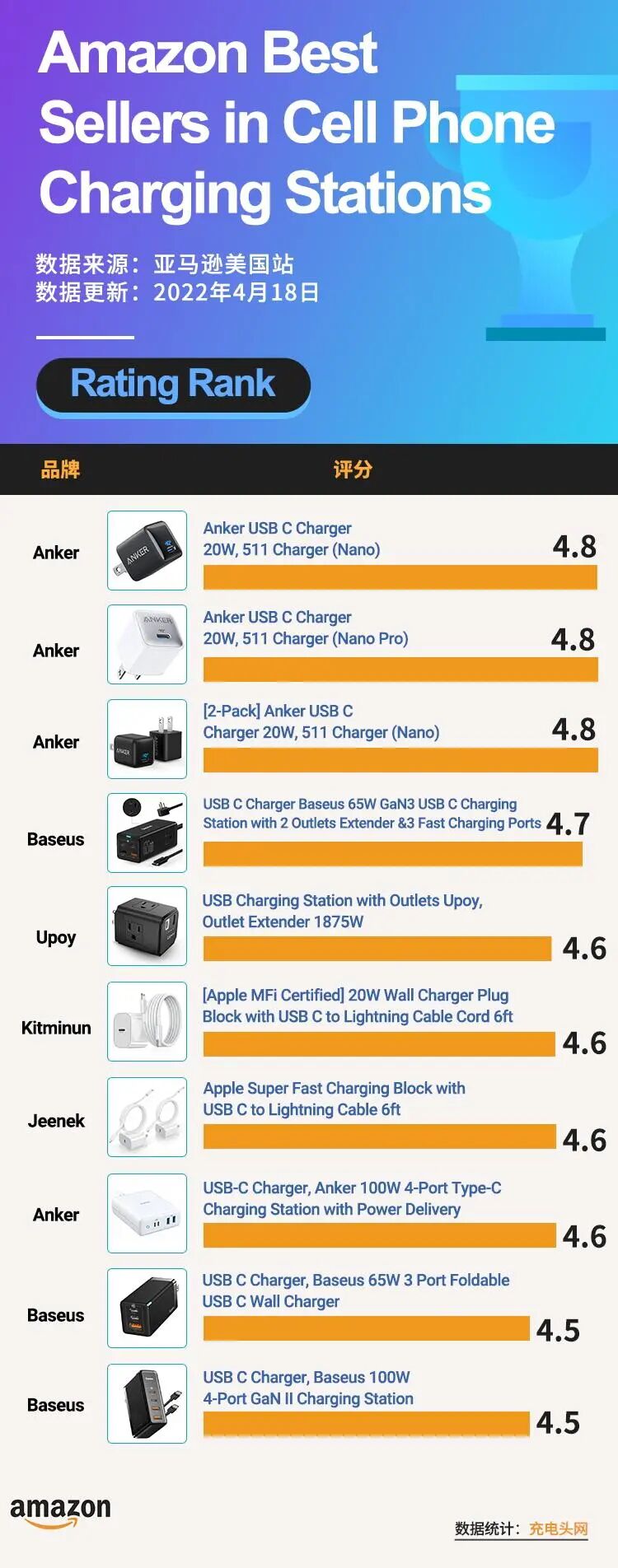 距离充电头网上次统计PD充电器榜单已经过去9个月,近期充电头网再次汇总一波,通过Amazon亚马逊的PD充电器榜单,带大家看看国外消费者的充电器都有哪些选购偏好吧。
