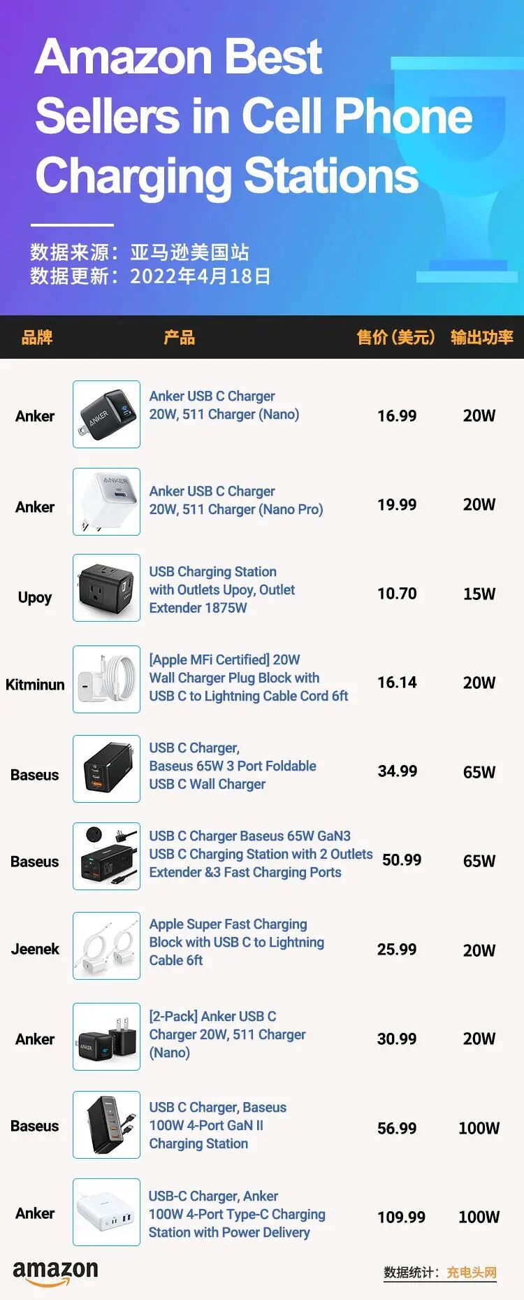 这十款产品的售价和其PD输出功率成正相关,输出功率越高,成本越高,售价自然而然水涨船高。