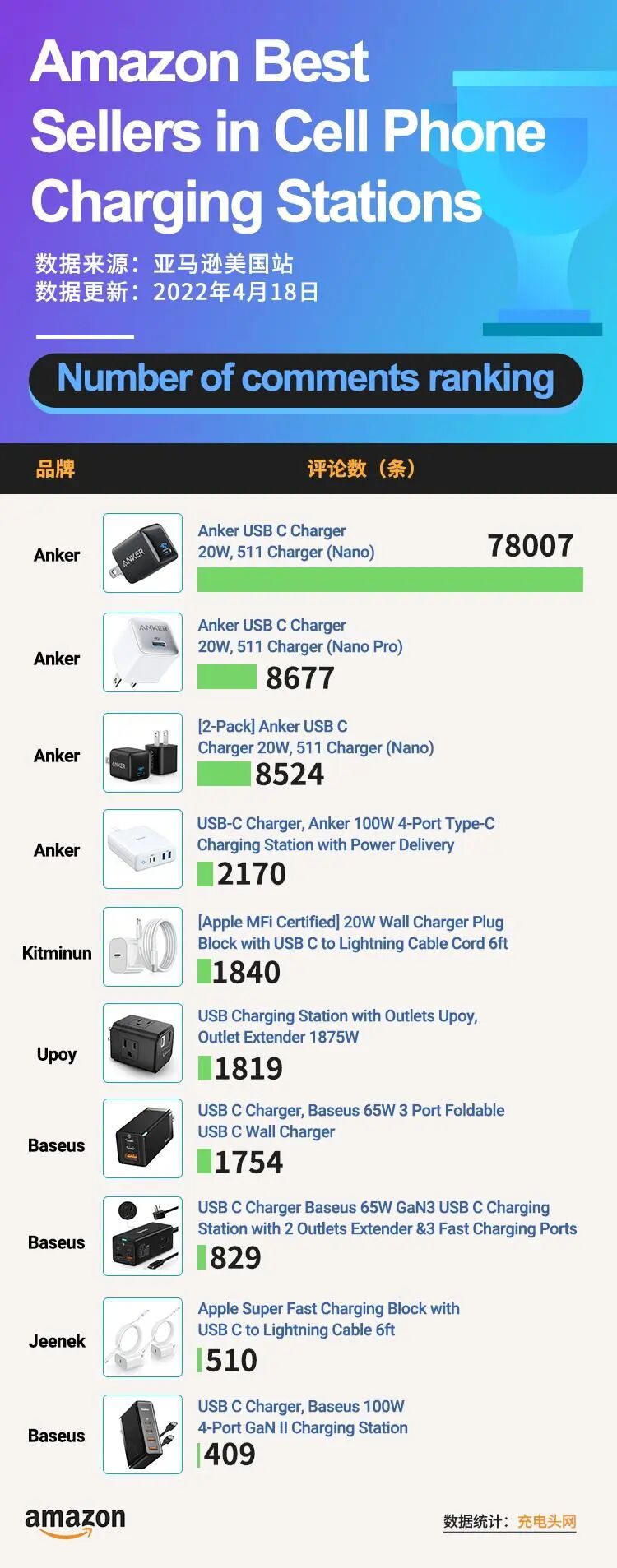 去年的亚马逊封店的余波并没有完全消散,苹果20W PD充电器以近12万条评论在评论量榜单中遥遥领先,比其余九个充电器评论数之和还多,可见虽然苹果不配充电器,但还是有很多用户对原装充电器情有独钟。