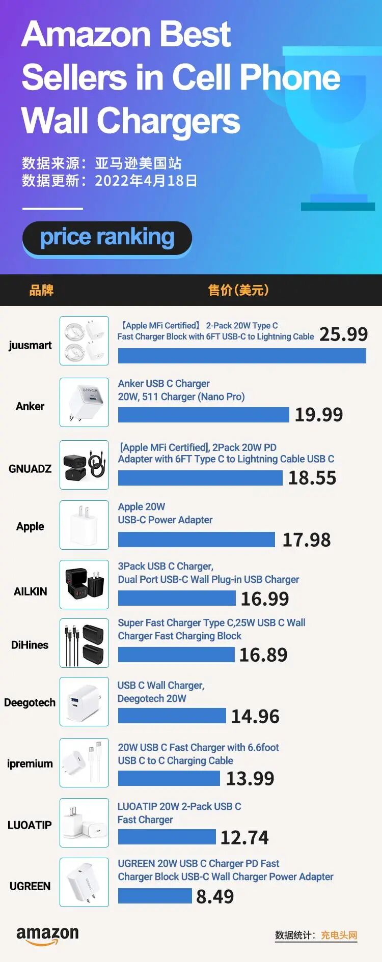 售价方面,此次榜单中总体价格差距不大。由于此次榜单中有四款是以套装形式出售,以充电器单只价格来看的话,最便宜的是AILKIN的 20W 1A1C充电器,提供两个输出接口的情况下单只折合售价不到6美元,性价比极高。