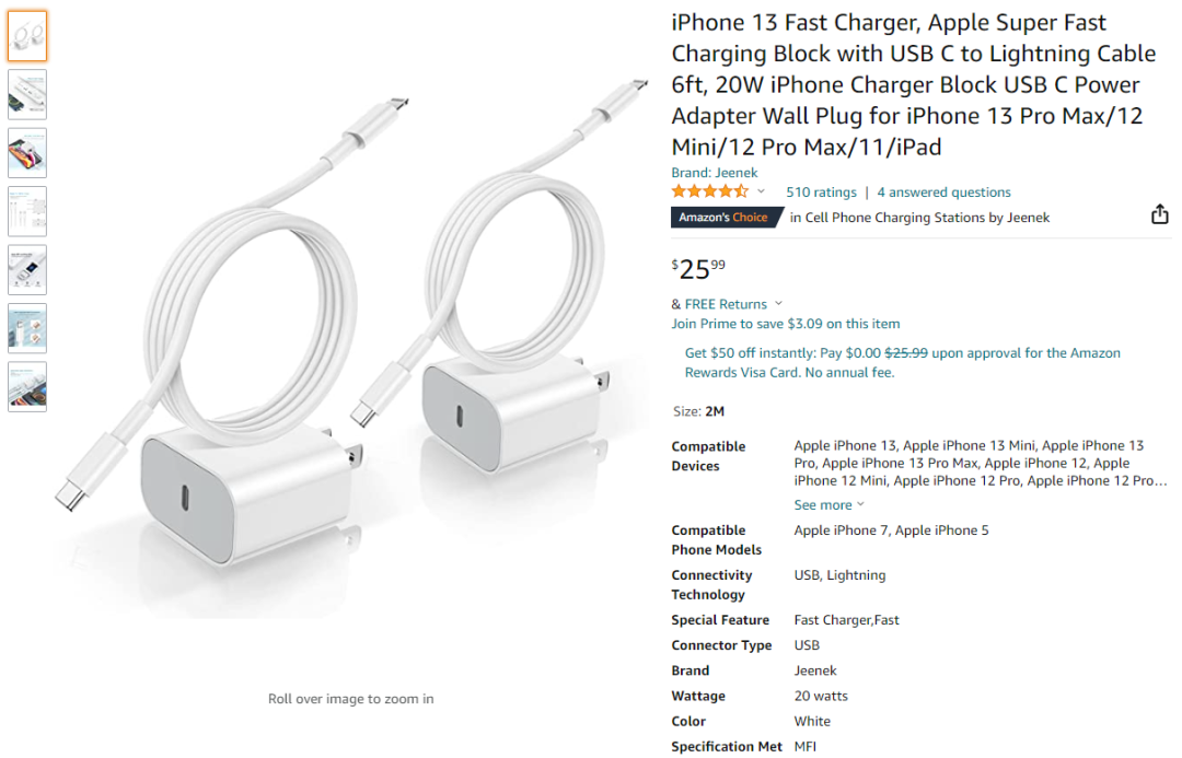 这款产品以套装形式出售,内含两个充电头以及两根6英尺 C-L线,通体白色设计,充电器和充电线均宣称通过MFi认证。