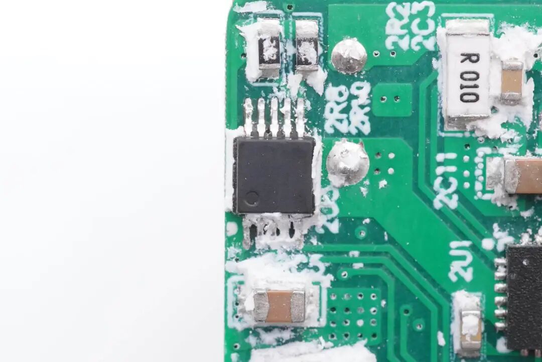 PCB板背面一览,焊接氮化镓功率器件和QR反激控制器,光耦和贴片Y电容,次级侧焊接同步整流控制器。