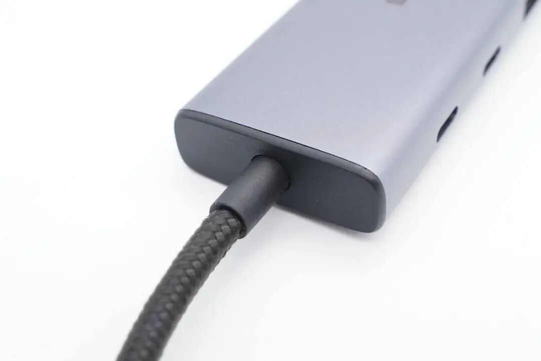 USB-C线缆采用同轴线设计,柔软手感好,这也是这款USB4扩展坞和普通扩展坞差别较大的地方之一,此外线缆线身外套编织外衣,更加耐脏耐用。