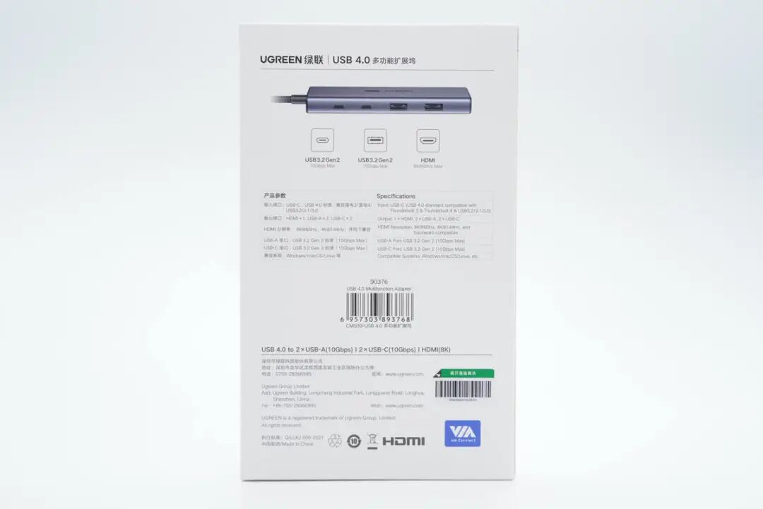 包装盒正面印有UGREEN绿联品牌、产品名称、外观图,此外还有5 in 1、可变刷新率、自动低延时、8K/60Hz等卖点,设计上和上一代的很相似。