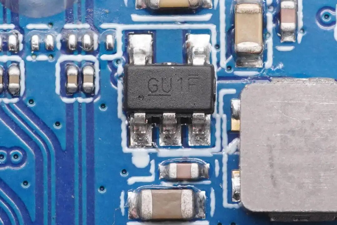 输入端一颗同步降压转换器,丝印GU,来自LEADCHIP岭芯微,型号为LC2201,支持5.5V输入电压,输出电压可由分压电阻配置,开关频率为2MHz,支持关断和过热保护。