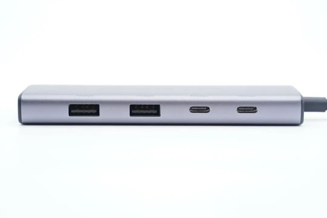 拓展坞机身主体外壳也是铝合金材质,并喷砂处理,两侧棱边过渡圆润,整体持握手感好,颜值也不错。