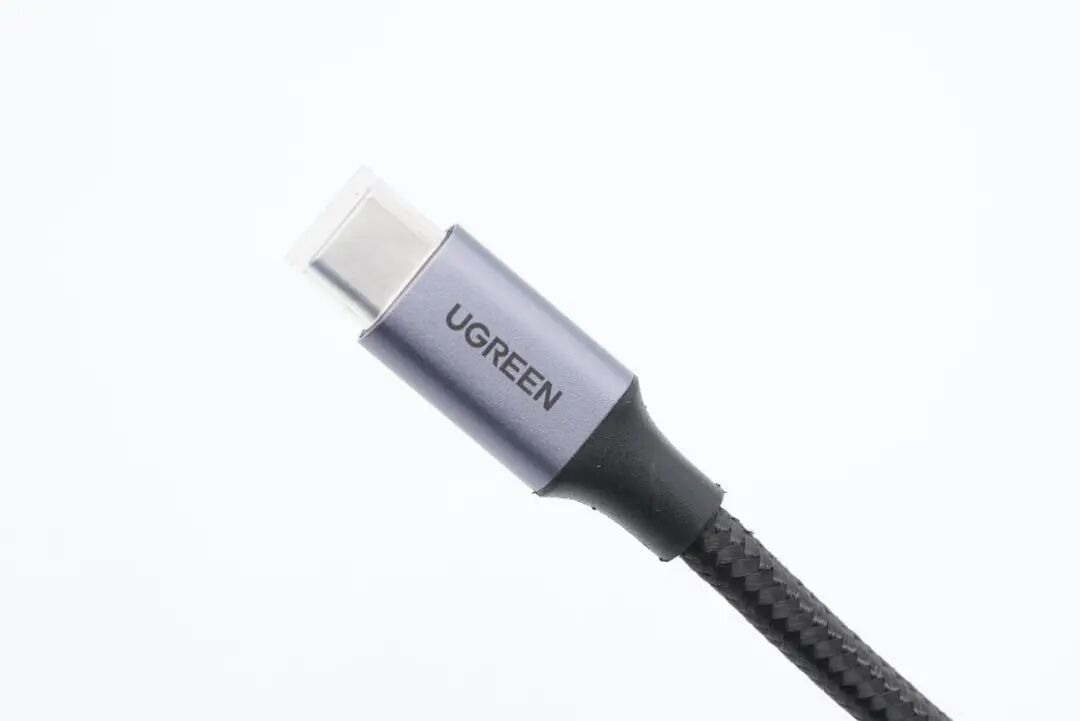 USB-C公头套有塑料盖防尘防潮,细节讲究。线头采用铝合金材质外壳,两侧圆润,同时表面喷砂以及镭雕UGREEN logo。