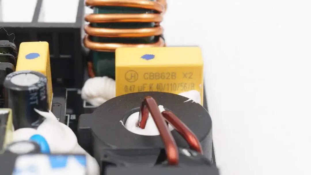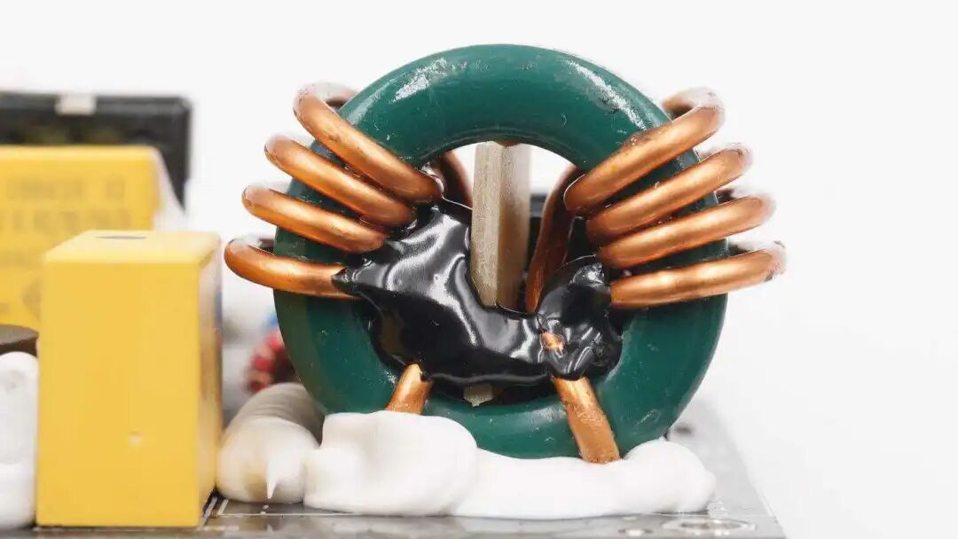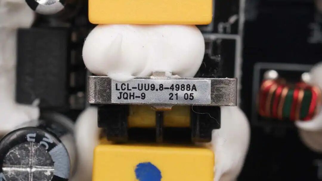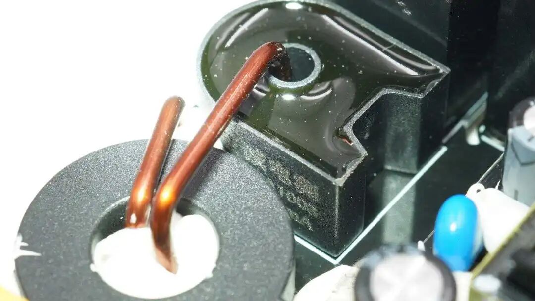 输入端共模电感特写,两线内置绝缘板并打胶水固定。电感底部涂白色胶水固定。