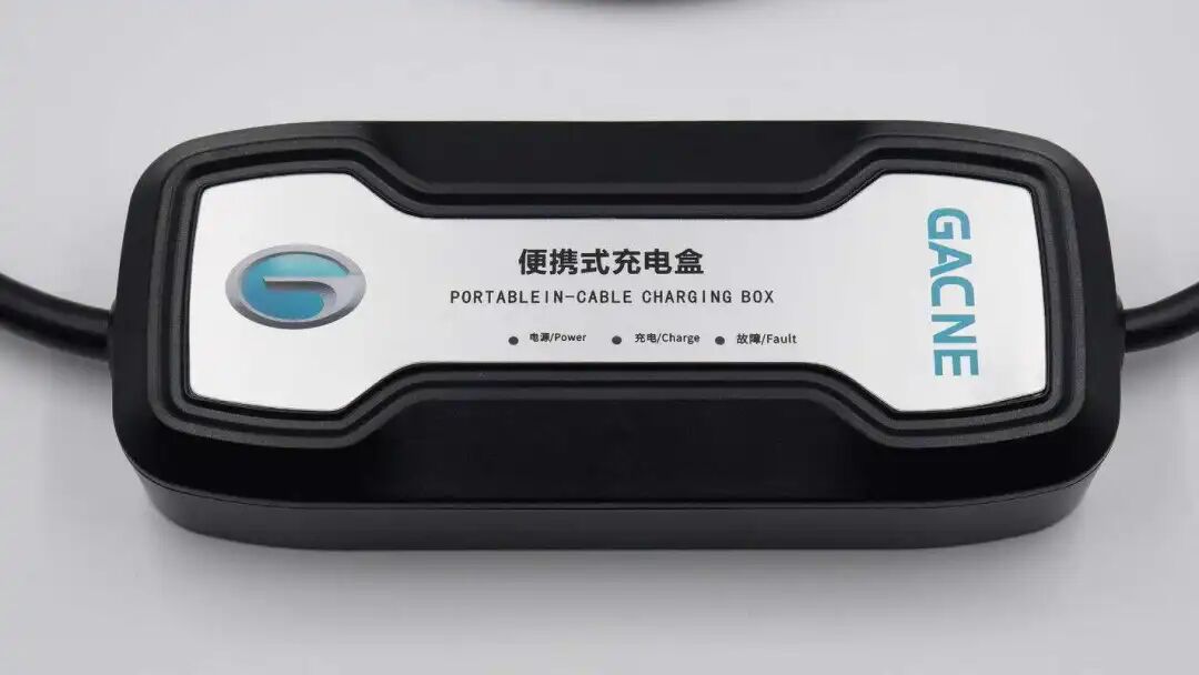 线缆间加入了一个便携式充电盒,外壳磨砂抗指纹,顶部凸起边缘倾斜,顶面贴有类似哑铃的白牌,除了广汽的logo、名称等设计外,在边缘还设有三个状态指示灯,分别对应电源、充电和故障。