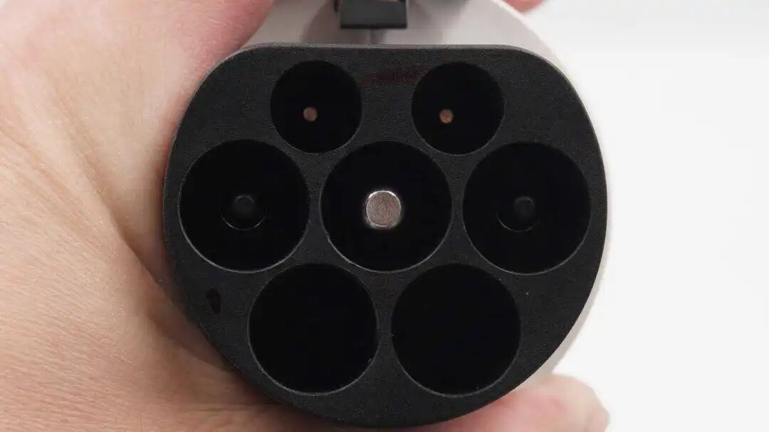 端部特写,设有七个圆孔,中心处有金属柱,贴合国内电动汽车的充电口设计。