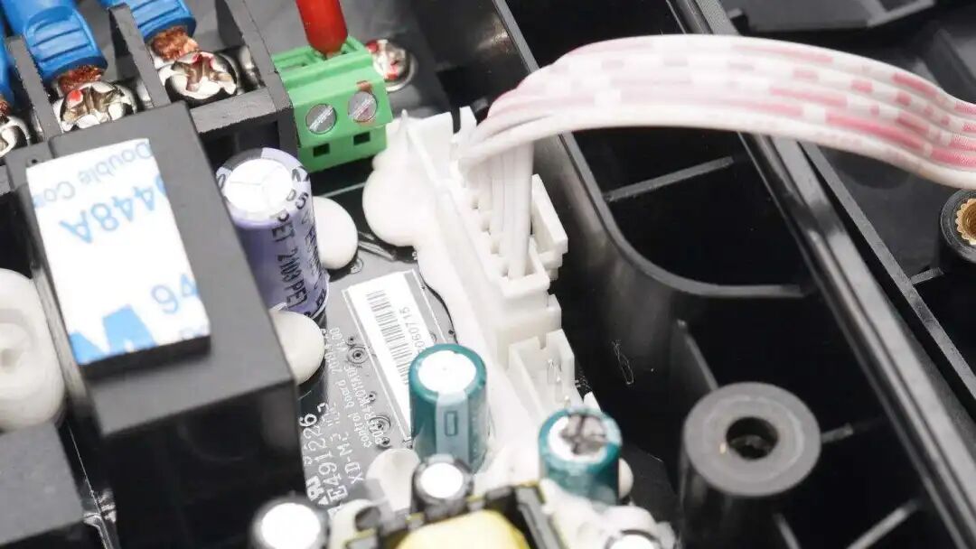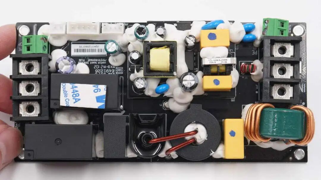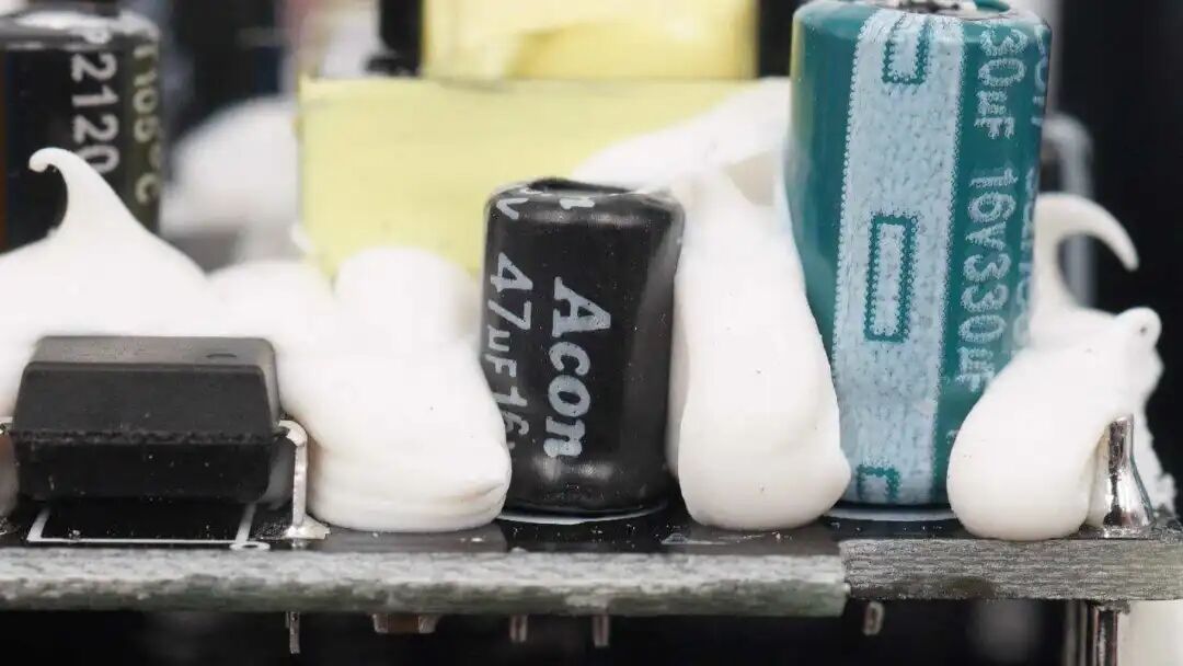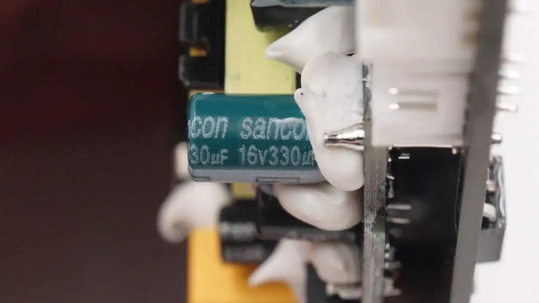 电源模块特写,采用集成电源芯片,大面积打胶加固,避免充电枪不慎跌落时造成损坏。
