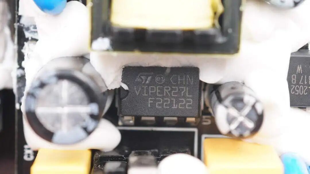 开关电源主控芯片来自ST意法半导体,型号VIPER27L,内置800V开关管,开关频率60kHz。