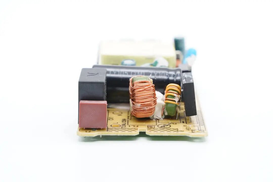 第一级共模电感,使用漆包线绕制在绿色磁环上,线间有电木板绝缘。