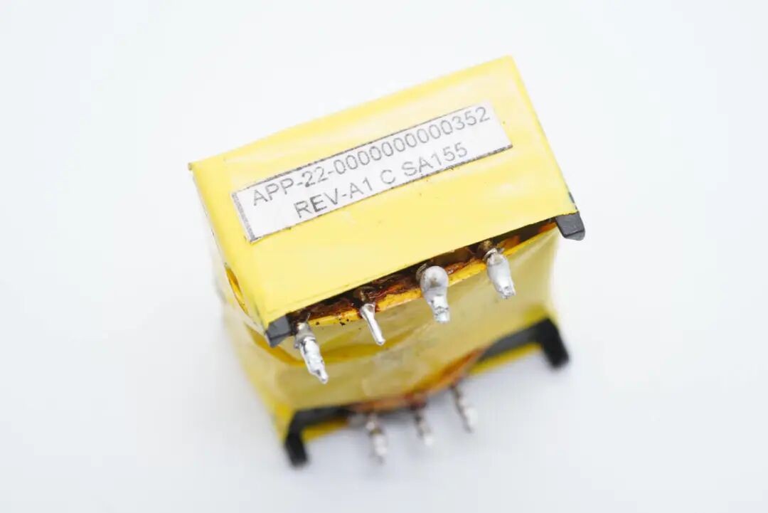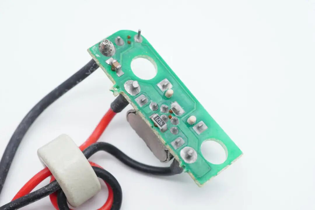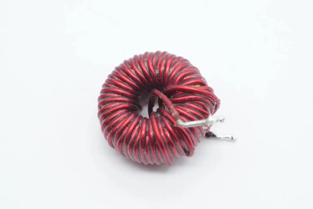 共模电感特写,绿色磁环,黄色和红色漆包线绕制,外面缠绕绝缘胶带。