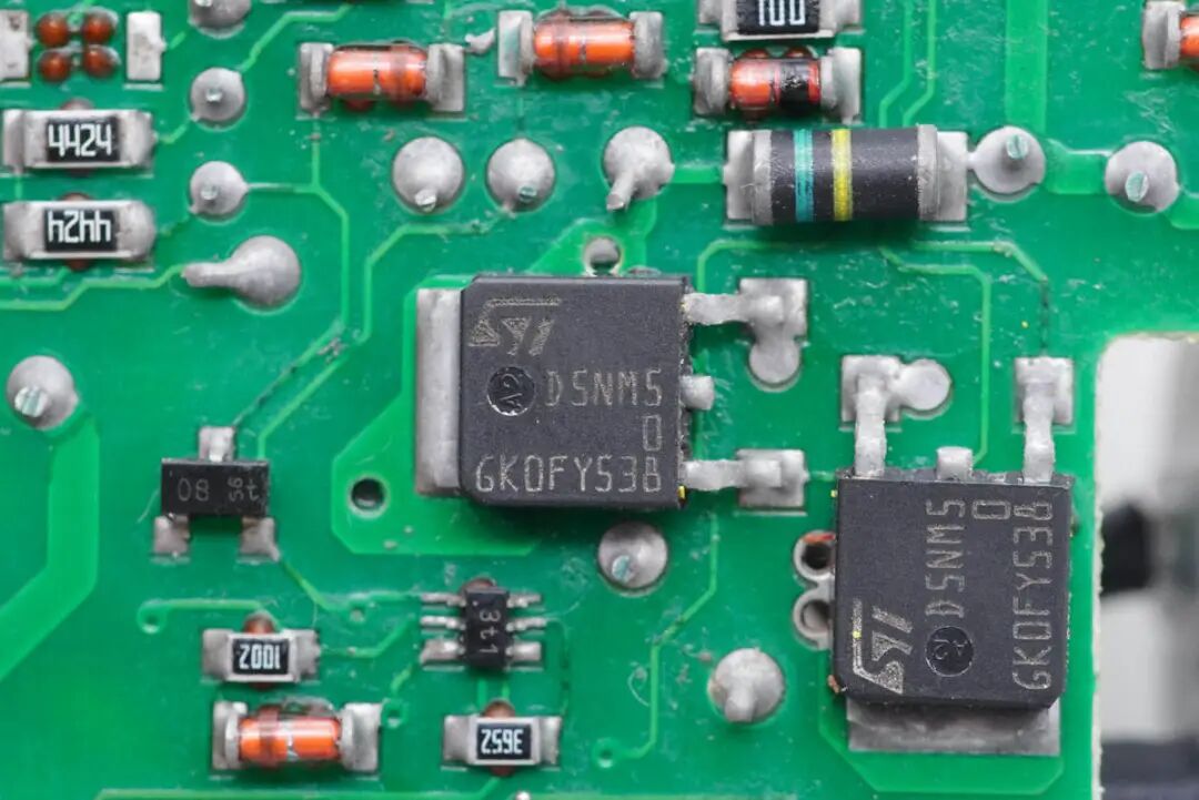 两颗开关管来自ST意法半导体 STD5NM50,NMOS,耐压500V,导阻0.7Ω,IPAK封装。