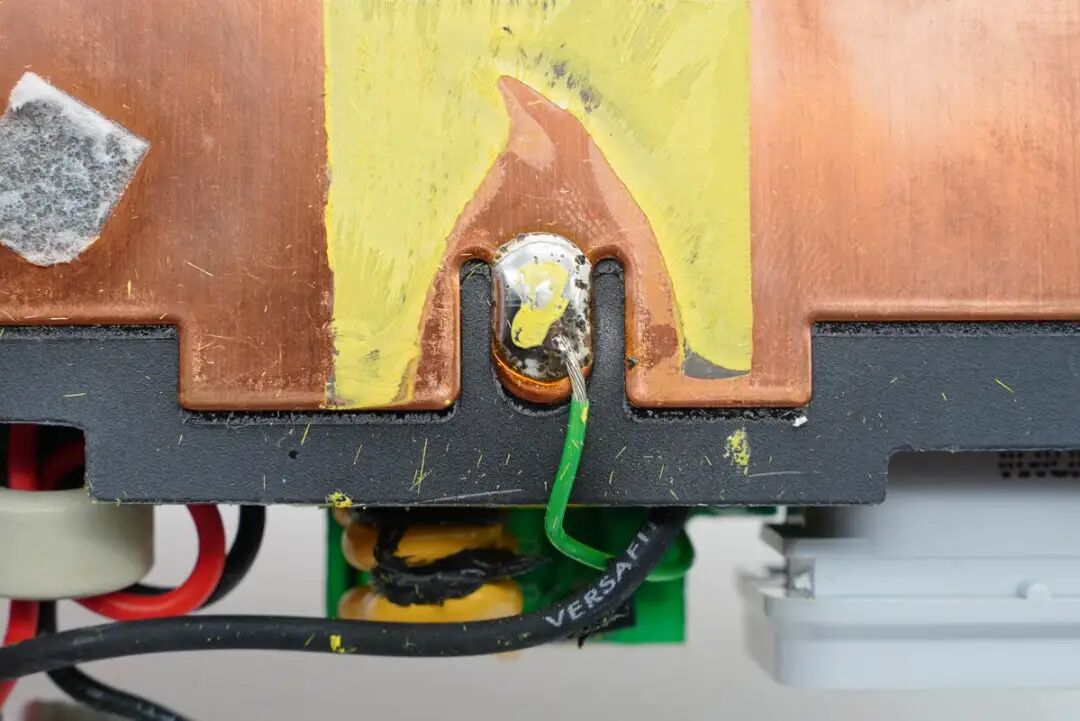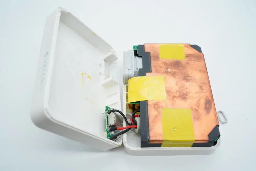 铜箔采用黄色胶带固定,电源输出插座采用螺丝固定在另外一半壳体内。