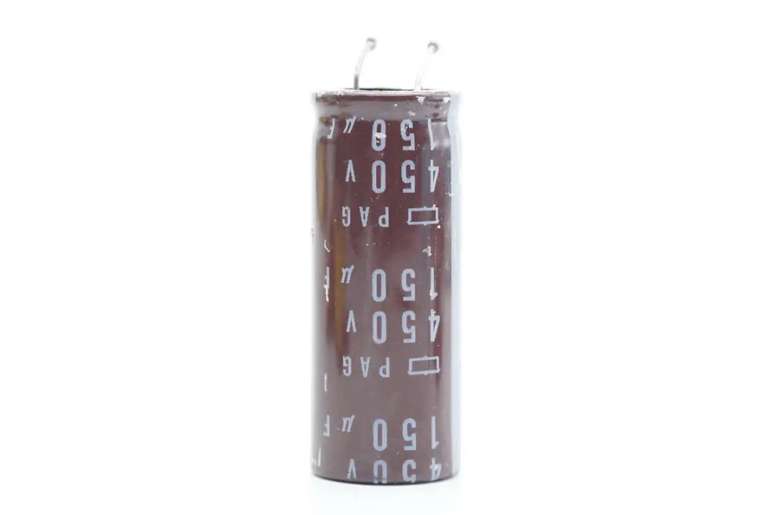 滤波电容来自贵弥功,PAG系列小型化高纹波,105℃耐热,寿命2000小时,450V耐压,150μF容量。