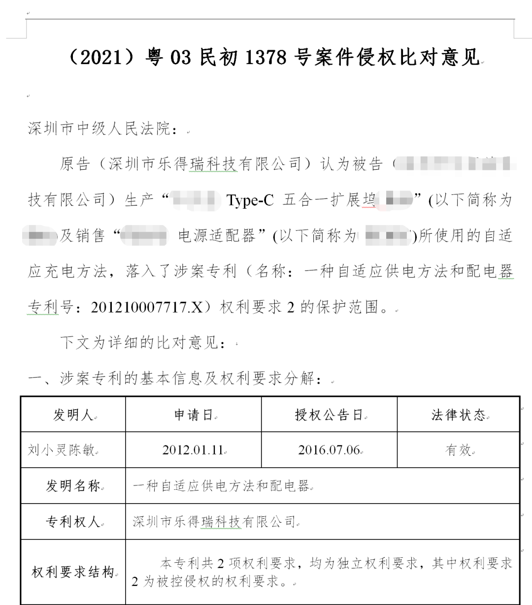 2021年3月,原告方深圳市乐得瑞科技有限公司以被告方在京东平台销售的USB-C接口扩展坞侵害原告在2012年1月份申请的发明专利《一种自适应供电方法》为由,一纸诉状将被告上诉至深圳市中级人民法院。