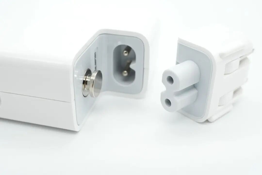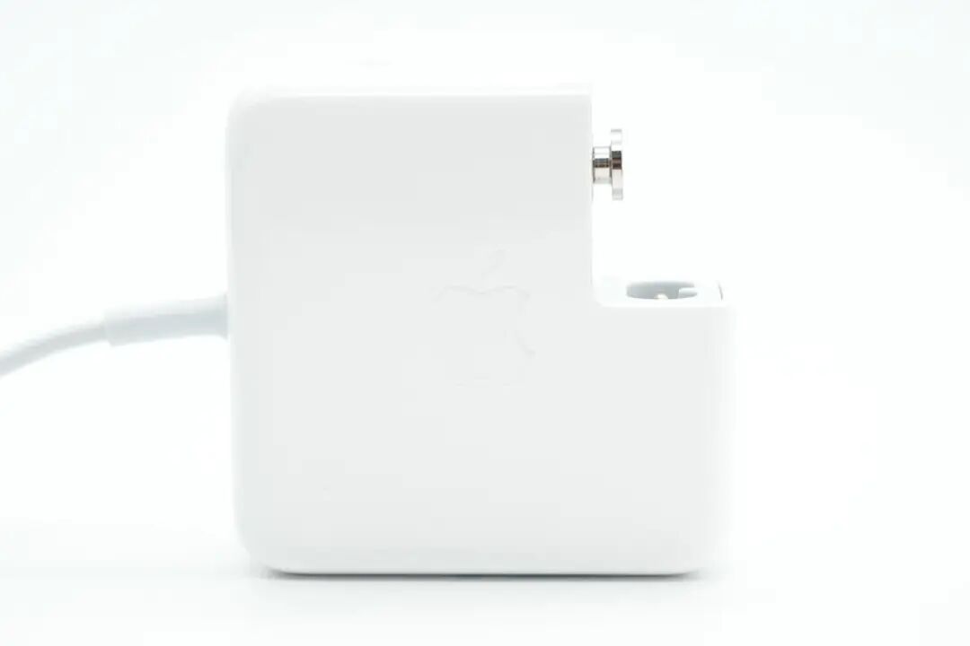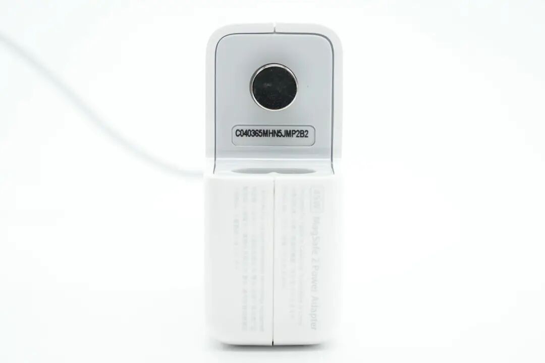 苹果45W MagSafe 2充电器采用经典方块造型设计,外壳光滑边角过渡圆润。插脚可拆卸设计大大提升用户使用体验,另外自带MagSafe 2磁吸连接线。