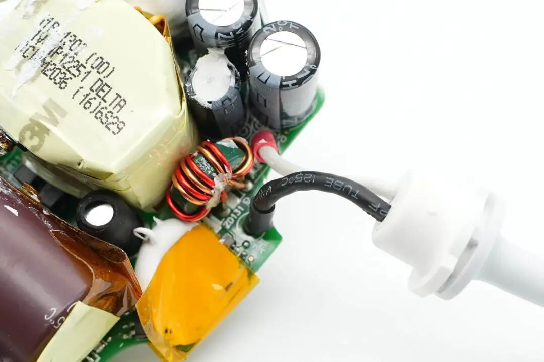充电头网通过拆解了解到,苹果45W磁吸充电器采用反激开关电源,固定电压输出,输出配有控制电路进行保护等功能。初级主控芯片来自台达,初级开关管来自英飞凌,次级同步整流管来自ST。充电器内部开关管均固定有散热片,内部采用日系电容,来自贵弥功和红宝石。充电器做工扎实,用料均来自大厂,使用寿命有保证。