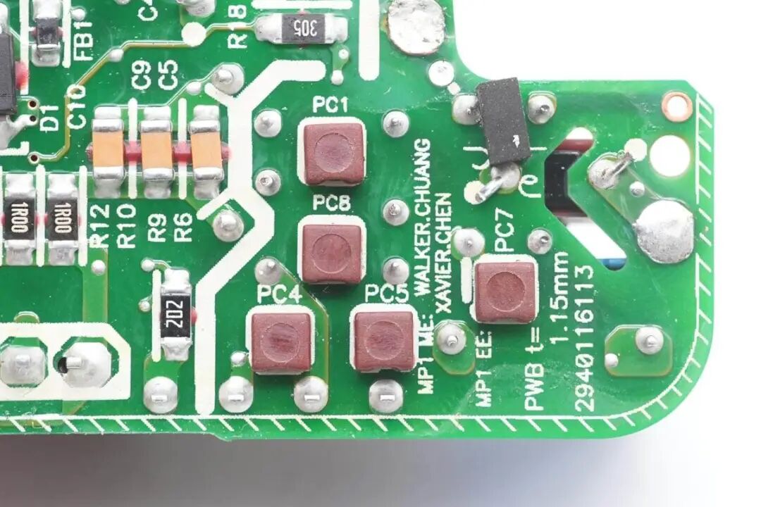 拆除电路板正面的插件元件,初级和次级的元器件下方还有一颗芯片。