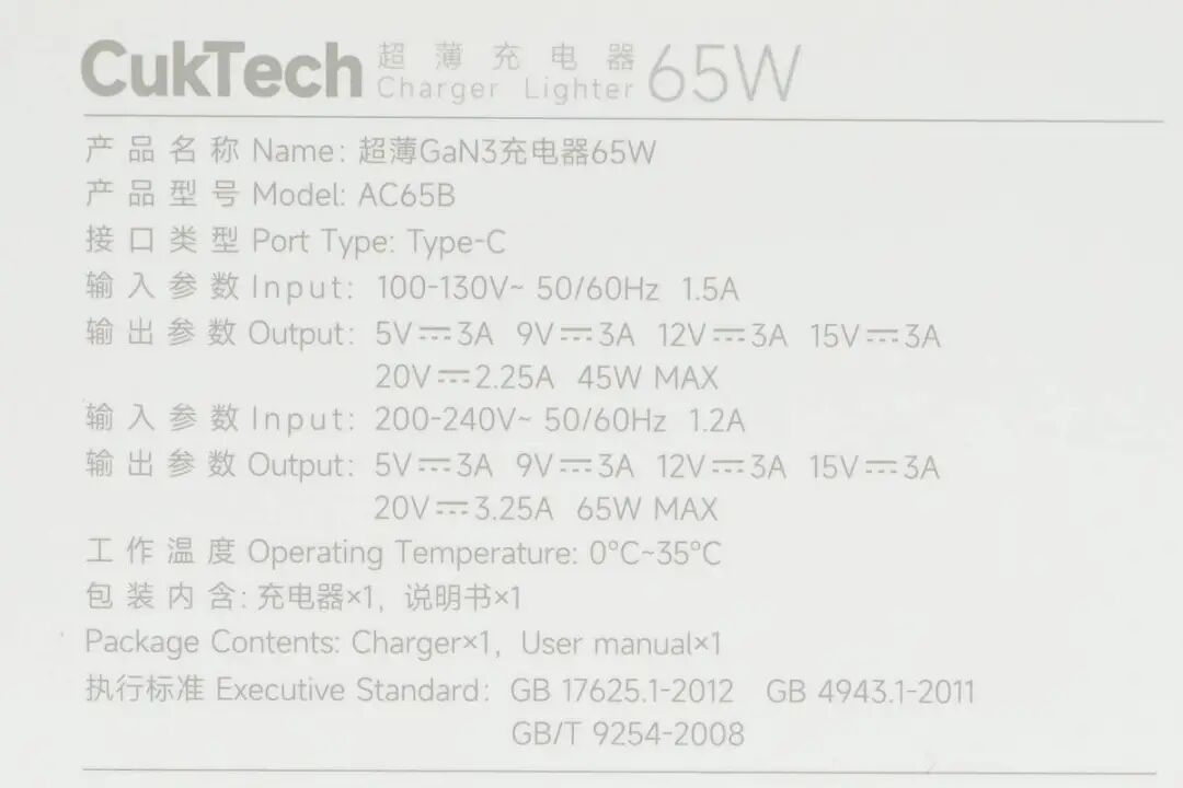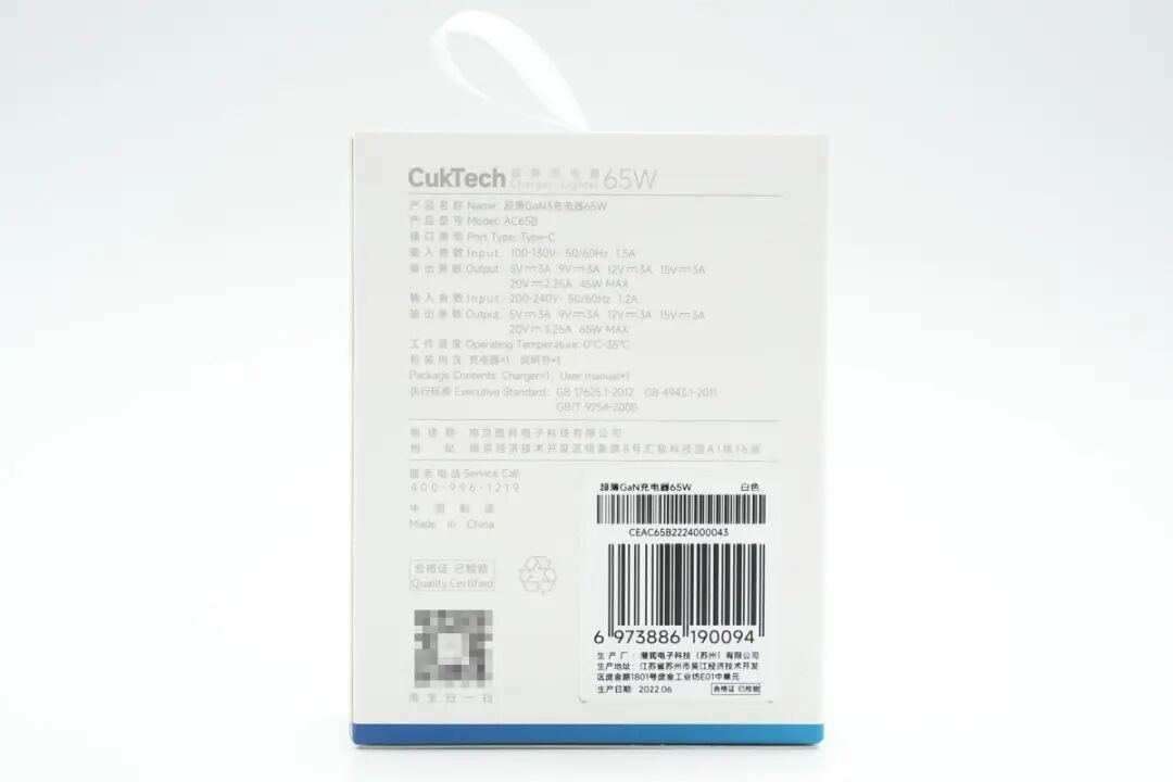 包装盒抽屉式设计,端部设有提手方便取出充电器,设计十分贴心。盒子正面印有CukTech 超薄充电器65W产品名称以及外观图,右下角还有GaN3标识,表明这还是一款氮化镓充电器。